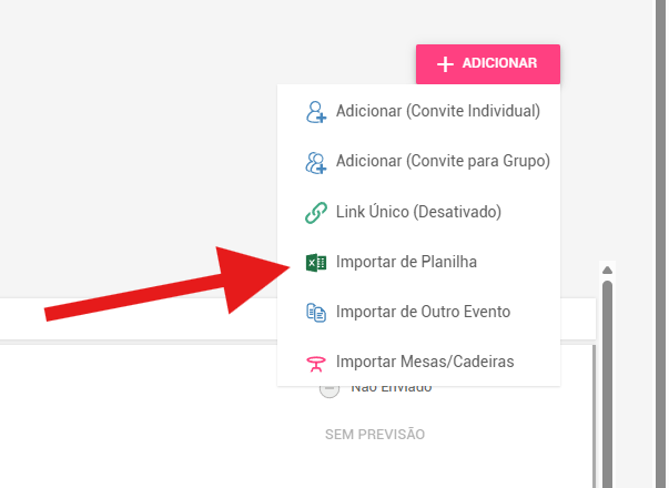 Para realizar a importação, é necessário acessar o evento pela versão Web, pois essa opção não está disponível no aplicativo. No menu, clique em Convidados e, em seguida, no botão Adicionar. Depois, selecione a opção Importar de planilha.