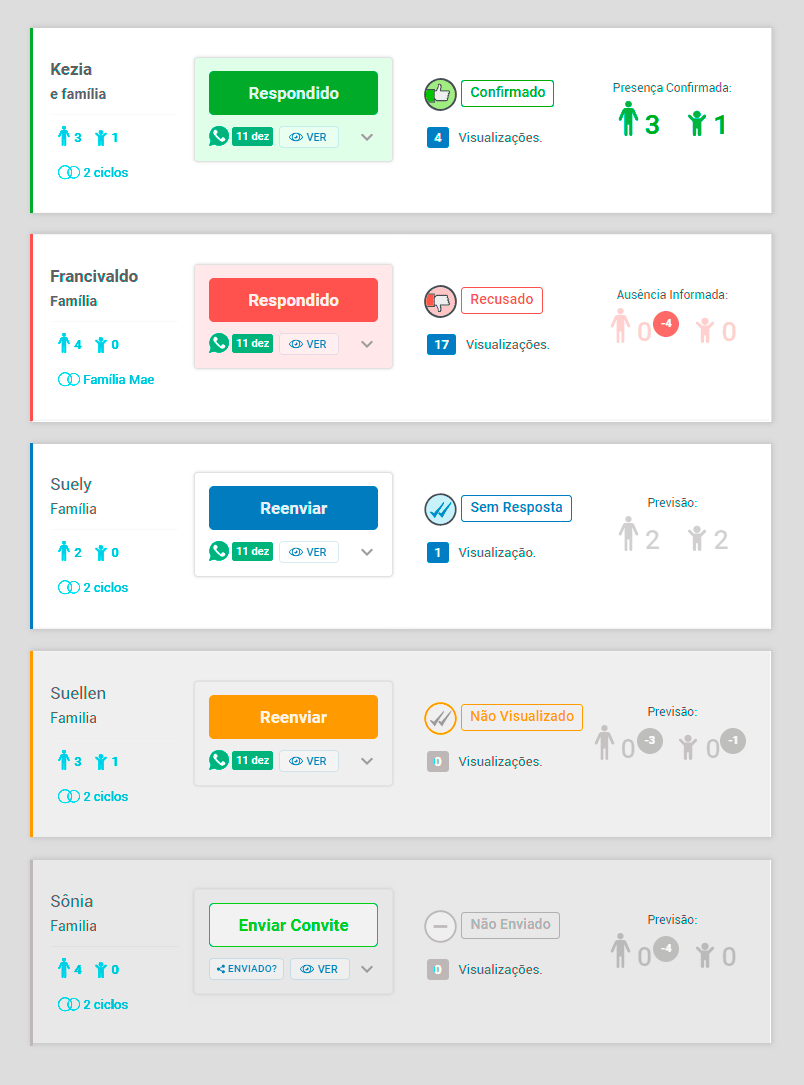 Os status se apresentam também nas cores dos convites listados na “Gerência”. A imagem a seguir apresenta cada situação e sua respectiva cor: