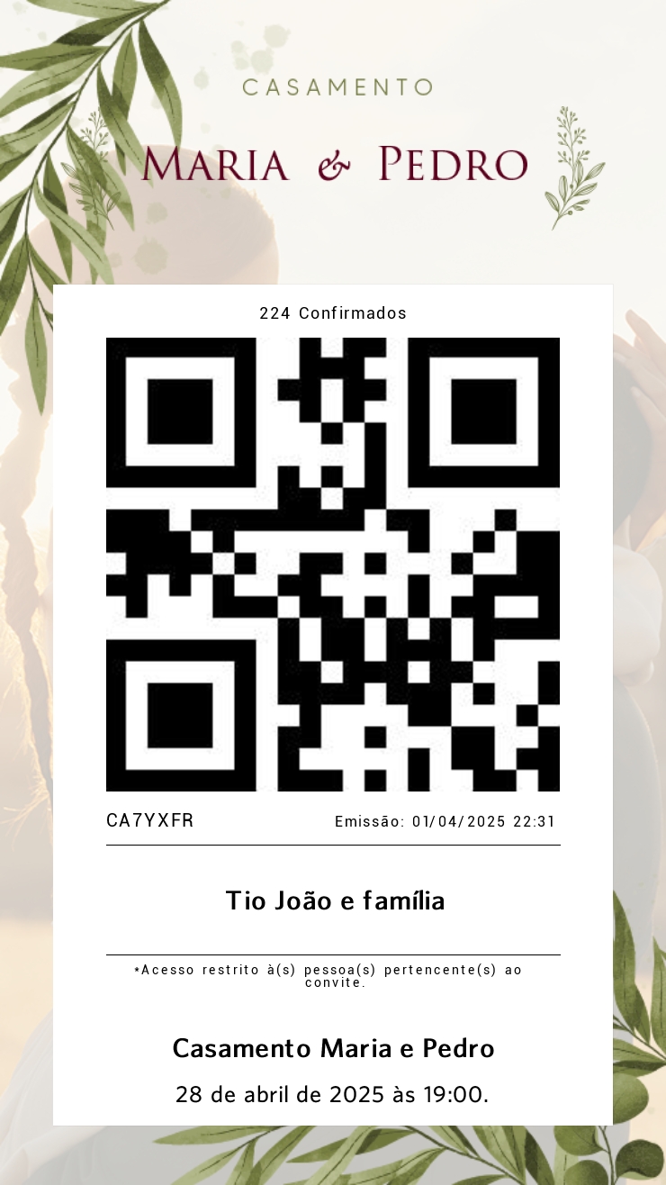 *** Vocês podem chegar em horários diferentes, a leitura do código será por pessoa. Para isso, envie cópia do código QR-CODE para a(s) outra(s) pessoa(s) pertencente(s) ao convite, para apresentar(em) na entrada.